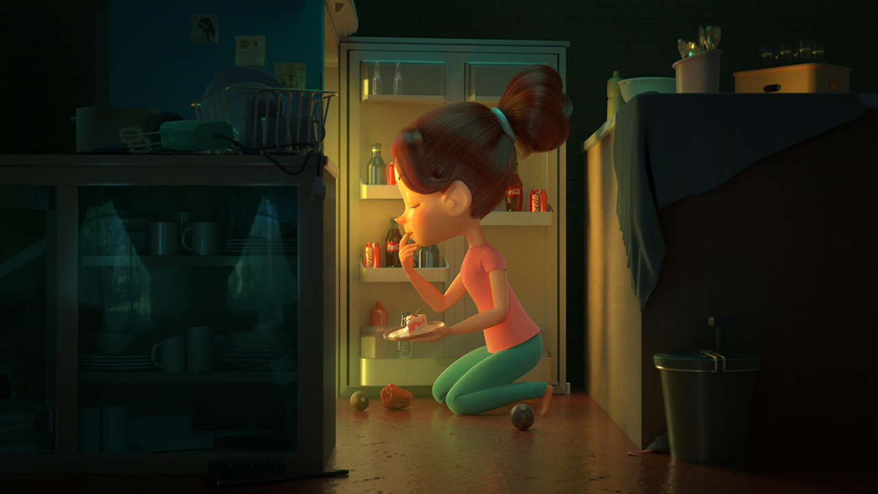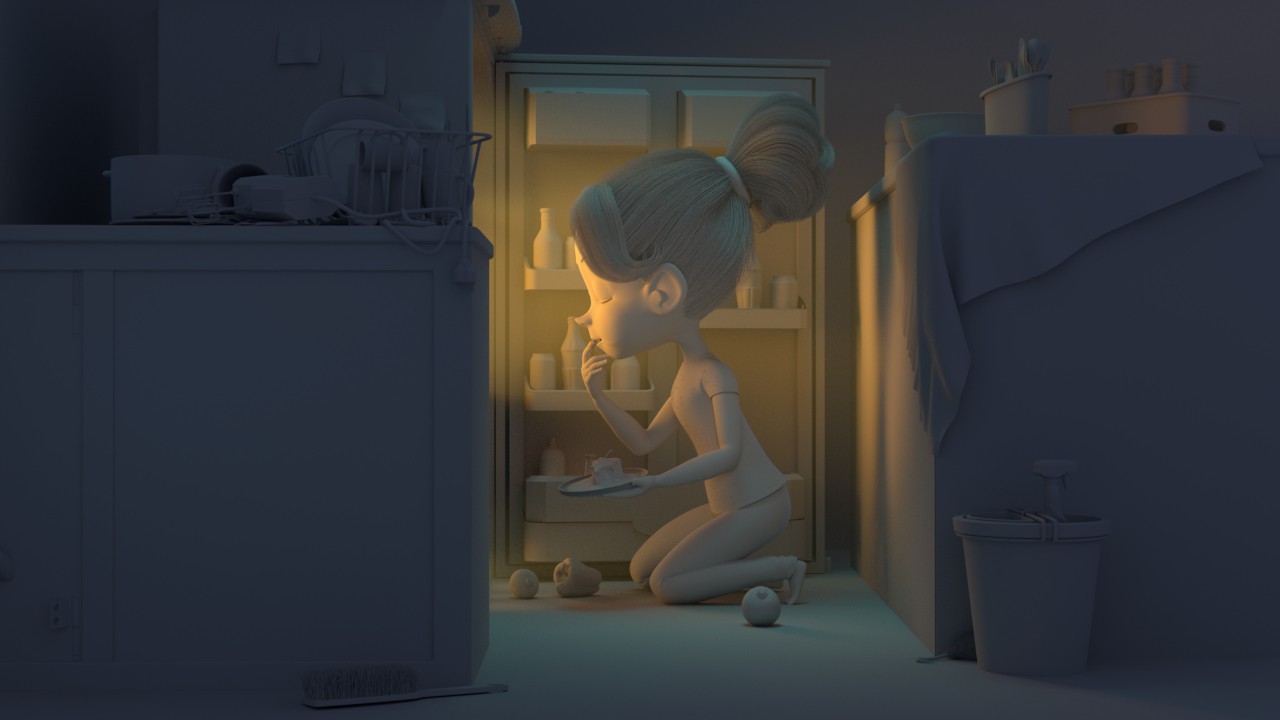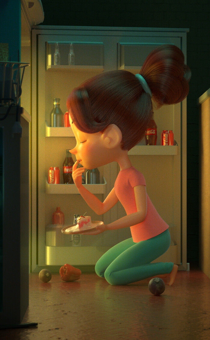 「Craving (真夜中の衝動)」についてお話ししましょう。これは、シングルフレームのレンダリング作品として制作したため、ワークフロー自体は特別なものではなく、一般的な手法を採用しました。制作のきっかけは「実際の写真をリファレンスとして、かわいいキャラクターでストーリー性のあるイメージを作ってみたい」と思ったのです。