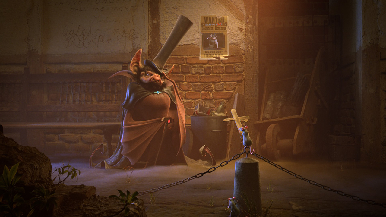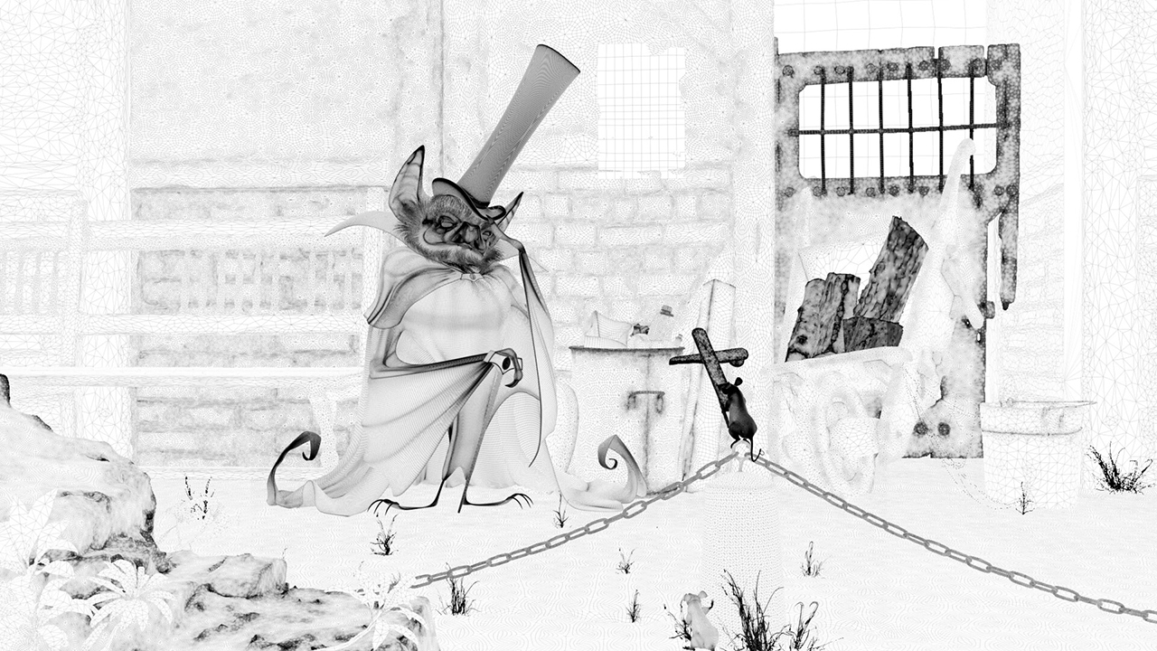シーンにボリュームを使用するのが好きで、この手法により作品全体に自然な奥行きと一体感のある仕上がりを実現できています。髪の毛は Maya の nHairシステム(ペイントエフェクト機能)を使ってカーブから生成しており、右下に隠れているネズミとシャツの細かい毛には XGen も使用しました。