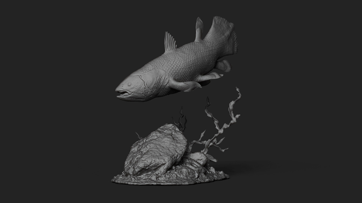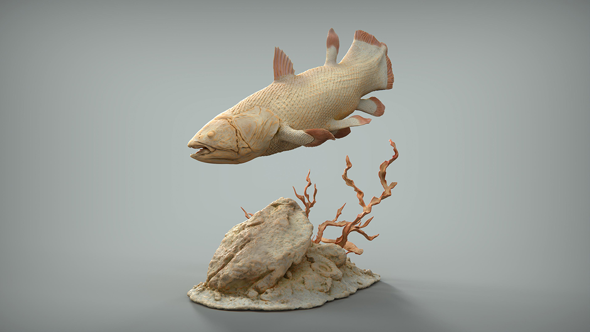 「Ceolacanth」:仕事の後、自由な時間に取り組んでいる個人プロジェクトです。生きた化石として知られるシーラカンスに以前から興味があったので、スカルプトしてみることにしました。化石の岩のような質感を表現するため、単色(モノクロマティック)の表現を目指しました