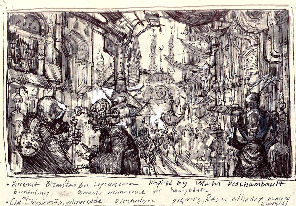 数年前から「Steambul」(スチームパンク+イスタンブール)という個人プロジェクトのアイデアを温めており、多くのコンセプトデザインを作成してきました。このアイデアは、トルコの文化的背景 と スチームパンク要素 を組み合わせたものです。私は通常、具体的なストーリーを書いてから ビジュアルの方向性を決めます。なぜなら、特定のムードや特徴がないと、簡単に方向性を見失ってしまうからです。