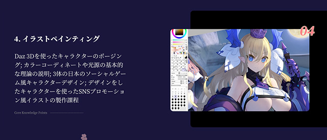 キャラクターデザインからイラストの制作までを一貫して行い、日本のソーシャルゲーム風イラストの描き方を学ぶ。Unreal Engine や Daz 3D を使った 3D背景・構図制作を学ぶ。