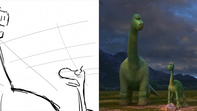 名作映画『アーロと少年』の舞台裏をのぞいてみましょう。アーロと父親のこのシーンが、ストーリーボードから最終アニメーションへと どのように命を吹き込まれたのかをご覧ください。(youtube より)