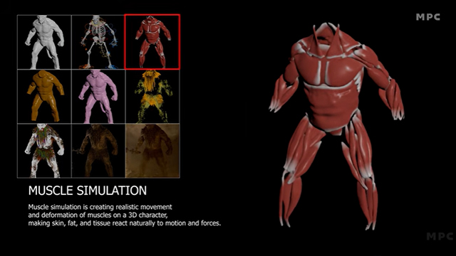 筋肉シミュレーション:3Dキャラクターの筋肉のリアルな動きやデフォメーション(変形)を再現し、皮膚、脂肪、組織が動きや力に対して自然に反応するようにさせる技術です。