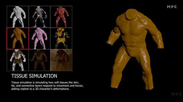 組織シミュレーション:皮膚、脂肪、結合組織などの軟組織が動きや力にどのように反応するかをシミュレートし、3Dキャラクターの変形にリアリティを加える技術です。