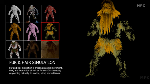 ファー&ヘアのシミュレーション:3Dキャラクターのファー(毛皮)やヘア(髪の毛)が、動きや風、衝突に対して 自然に反応し、リアルな動きや流れ、相互作用を生み出す技術のことです。
