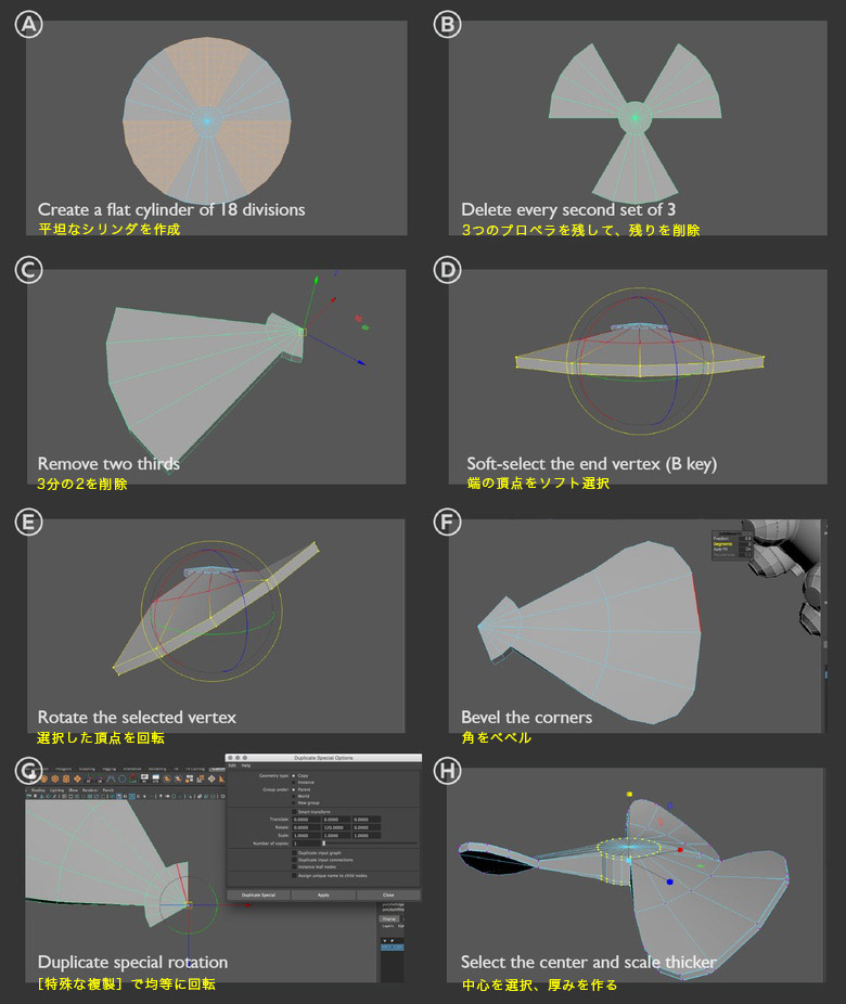 プロペラを作るには、まず[分割数]:18の円柱を作成(A)、3つのグループフェースを残し、他を削除します(B)。次に3分の2を削除し、先端の頂点をソフト選択します(C)。ソフト選択は、[B]キーを押しながらマウスドラッグして微調整できます(D)。角にベベルを適用(F)。[編集]>[特殊な複製]でパーツを均等に回転させましょう。オプションを選択、[コピー]をオンにした状態で[回転Y]:120度に設定(G)。これを2度適用して3つのパーツが組み合わさったら、[メッシュの編集]>[マージ]で頂点をマージして、厚みを出します(H)。
