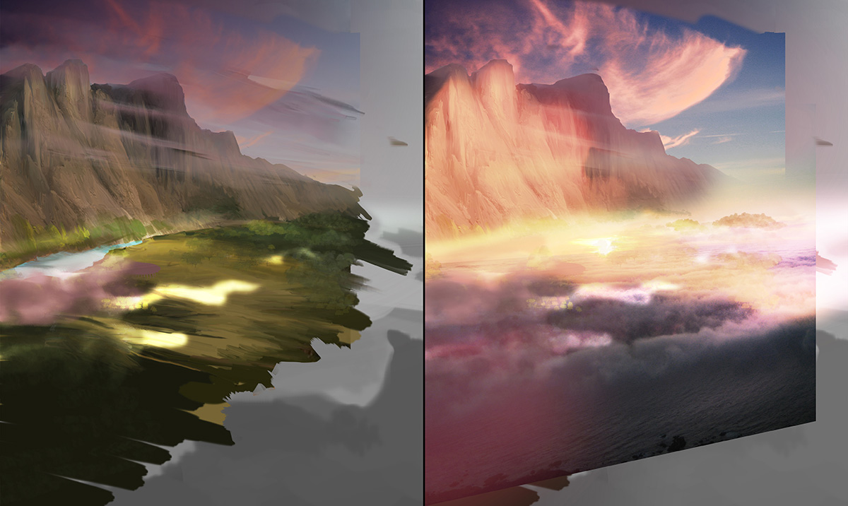 背景に取り掛かり、山と地表の基本的な形・色を描きます。イメージの解釈については、まだ考えていませんでした。2つのイメージを組み合わせながら、ストーリーに着手。渓谷をファンタジー風にしたいと思いました。Tosorは、丘から地表を眺めながら、深く息を吸い込んだはずです。したがって、景色には調和が醸し出されている必要があります。
