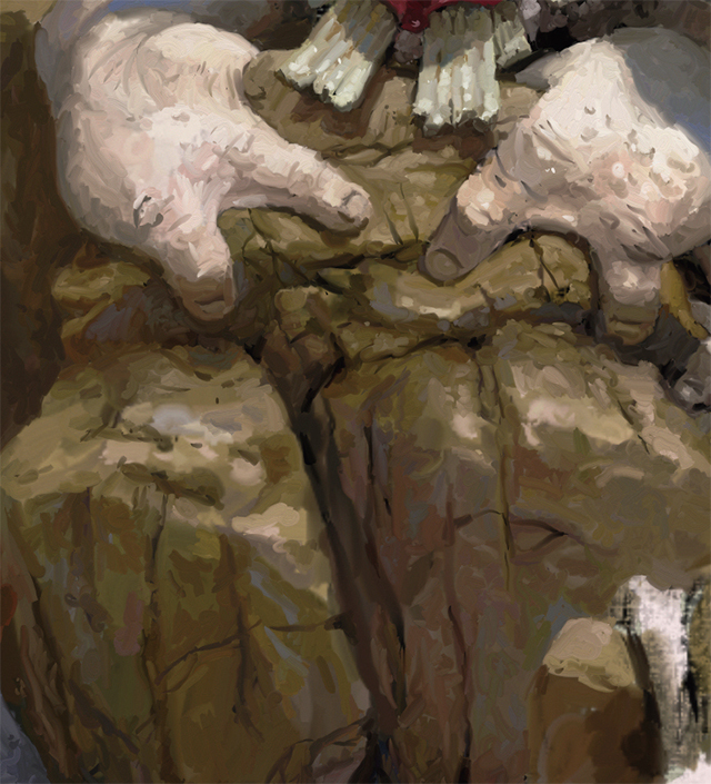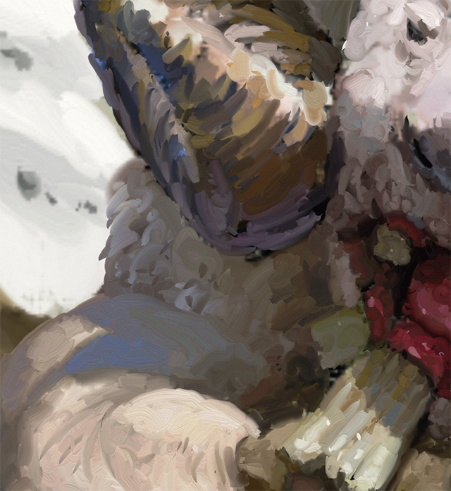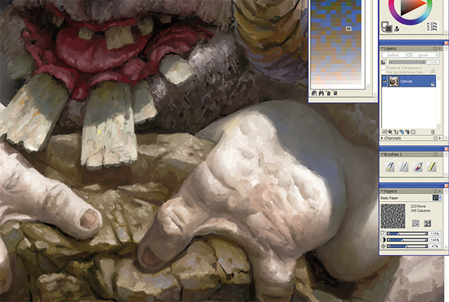 ArtRage から PSD形式 でイメージをエクスポートし、Painter でロードします。細かいディテールには、小さく、ソフトで、粒子の粗いブラシを使用します。不透明度(Opacity)と補充量(Resaturation)を筆圧で調整し、わずかなにじみを追加します。ブラシを強く押したときは、キャンバスに色が濃くペイントされます。軽く押したときは、既存の色に滑らかにブレンドされます。高いズームで作業します。通常は100% にして、口、手、ツノに最終的なディテールを加えていきます(図13)。