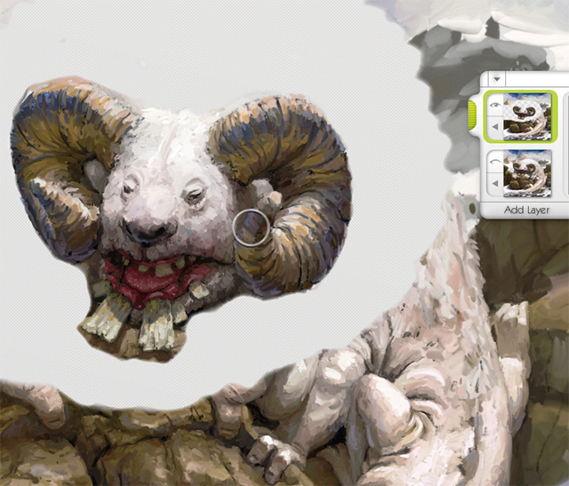 しばらくの間、何か引っかかっていたのですが、その理由がわかりました。クリーチャーの頭部が右に寄り過ぎて、そのままになっているようです。残念ながら、ArtRage 2.5 にはカット&ペースト機能はありません。別のアプリケーションに書き出すとペイントの深度情報を失うことになるでしょう。そこで、別の方法で修正する必要がありました。新規レイヤーにキャンバスを複製し、ペーパー設定のオプションでレイヤーの不透明度を0 に設定します。キャンバスの表示をオフにして、新しいレイヤーで頭部以外をすべて消します。キャンバスの表示をオンに戻して、正しい位置に頭部を配置します。それから、キャンバスのレイヤーを結合し、粗いエッジ部分を調整します。ArtRage の次期バージョンではカット& ペースト機能が搭載されることを願っています(図11)。