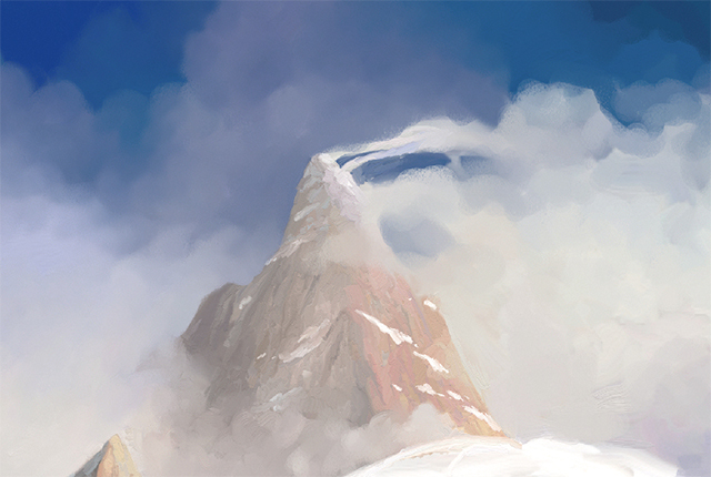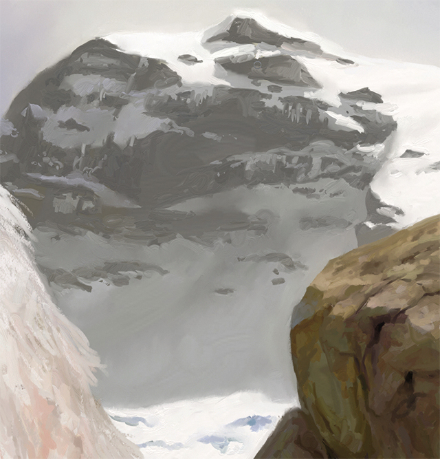 雪の原野では主にブレンドブラシを使用し、場合によっては小さなディテールブラシで軽くペイントします。灰色の崖の影になっている遠くの雪は、下からわずかに照らされているので、上方に投影されている影は柔らかくなっています。これは、下の雪の斜面に反射する太陽光を考慮したからです。雪からの反射光は、雲や空からの反射光よりもわずかに強いはずです(図17)。