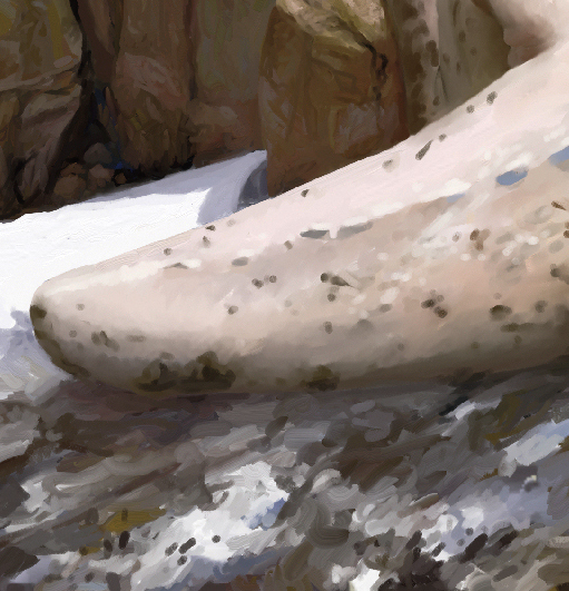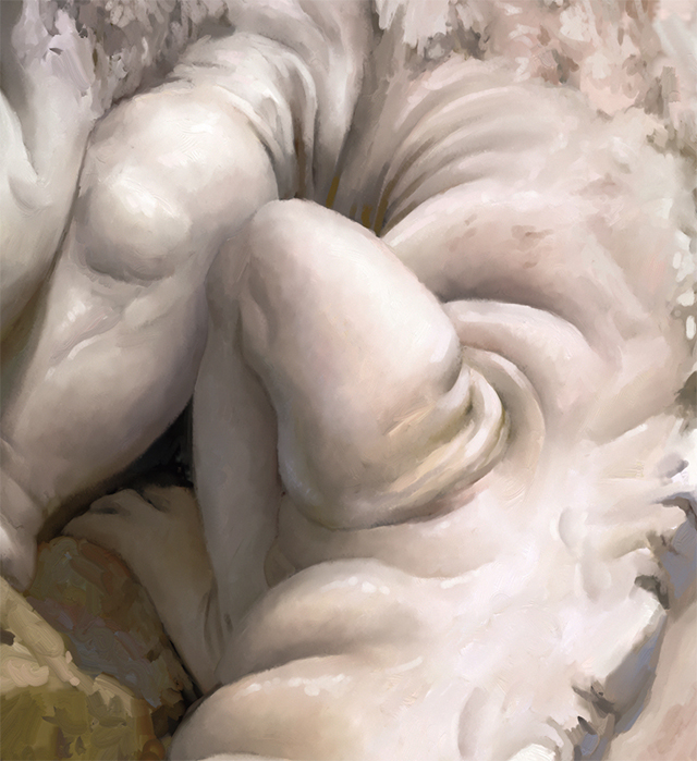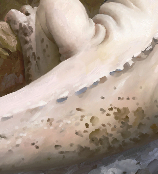 小さなディテールブラシとブレンドブラシの連携で、エッジや折り目を強調しながら、クリーチャーの皮膚を滑らかにします。また、ディテールブラシで胴体の中央部に向けてさらに不規則なシワをペイントし、毛皮に厚みのある外皮のような印象を加えます(図15)。
