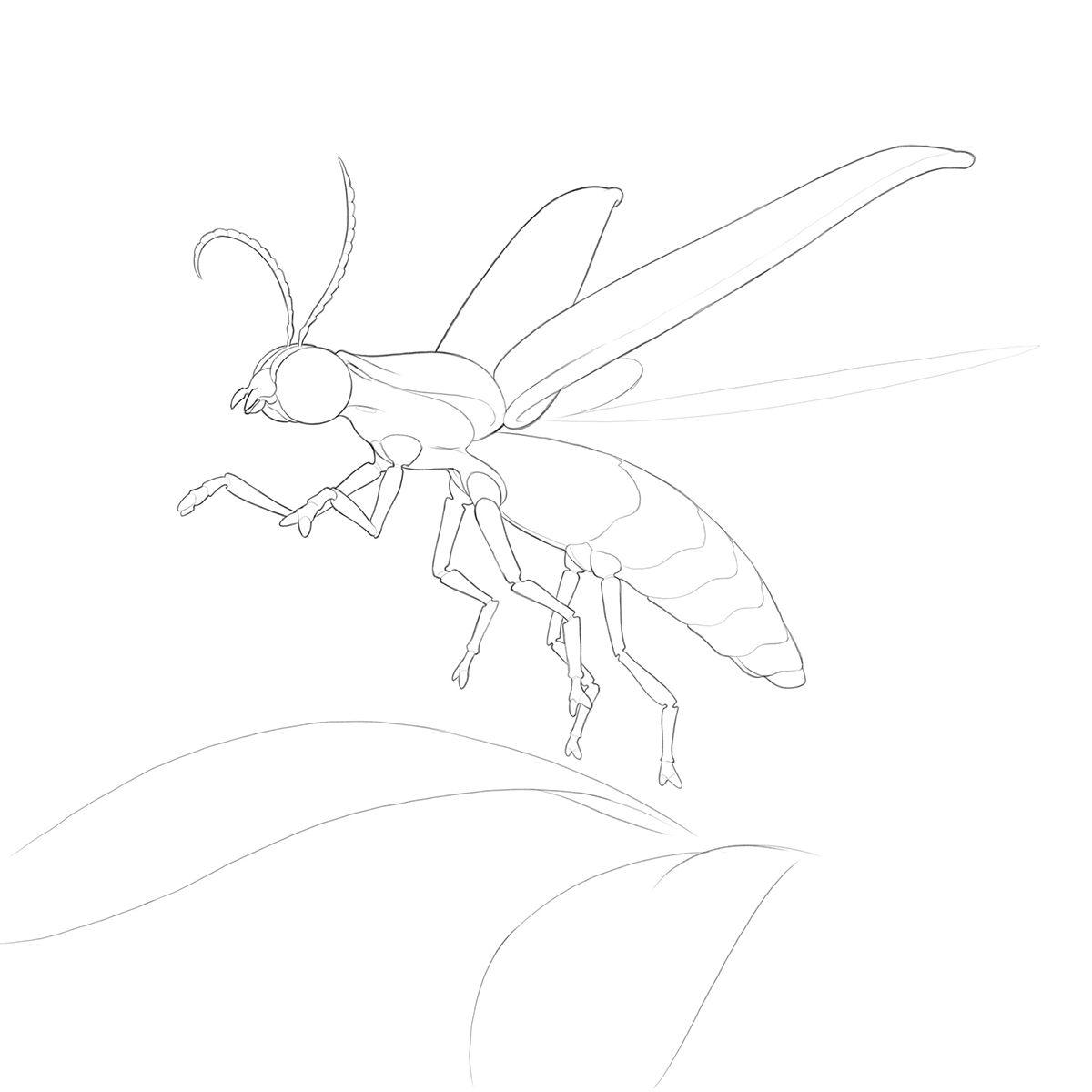 線画が完成したら、レイヤーマスクの作成に移ります(3Dでは「クラウンパス」と呼ばれます)。独自のオリジナルのレイヤーマスクを作り、最初のカラーパスに使用しましょう。夜の環境を表現するため、全体的に寒色系の緑の背景を選択しました。ホタル自体は背景から際立たせるため、暖色系の色調でペイントしています。