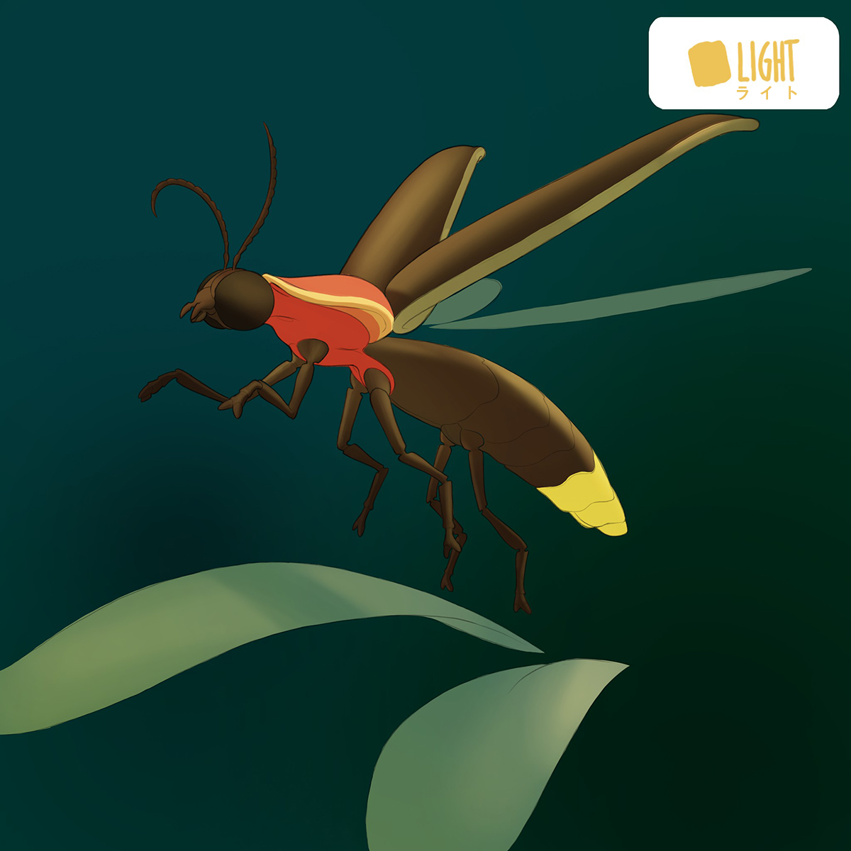 ソフトイエローの光が表面を表現し、ホタルの色彩の鮮やかさを引き立てます