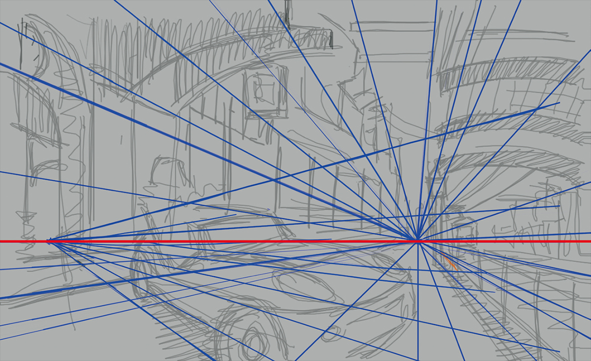 ここではシンプルな 2点透視図法を使いました。パース線を新規レイヤーに置いておくと便利です。制作中は、レイヤーの表示/非表示を切り替えながら作業を進めることができます。また線画を描くときは大ざっぱに描き、作業が進んだら必要に応じてパースペクティブのレイヤーを参照するのもよいでしょう。
