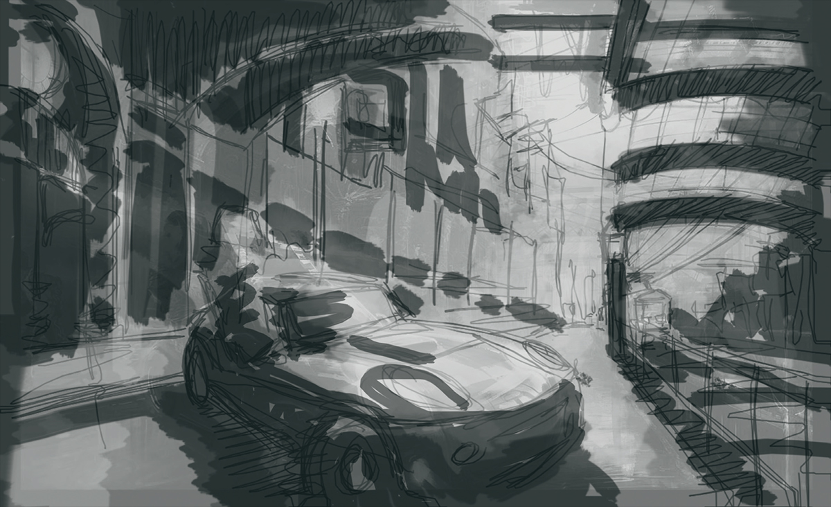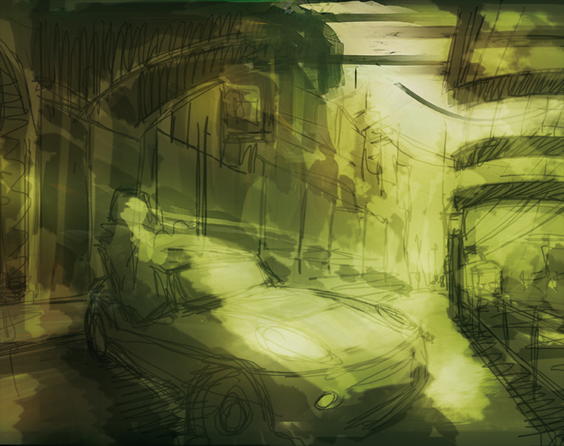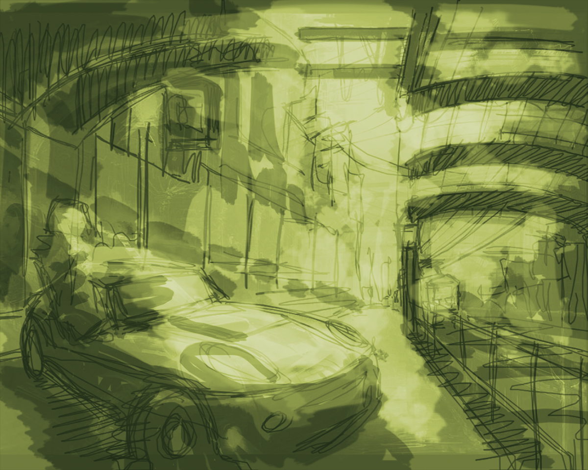 次に、光の方向とこれから描く雰囲気を決めます。ここではメインの光源を右上側に設定して、約45度の角度で通路や自動車に光を当てようと思いました(図03)。