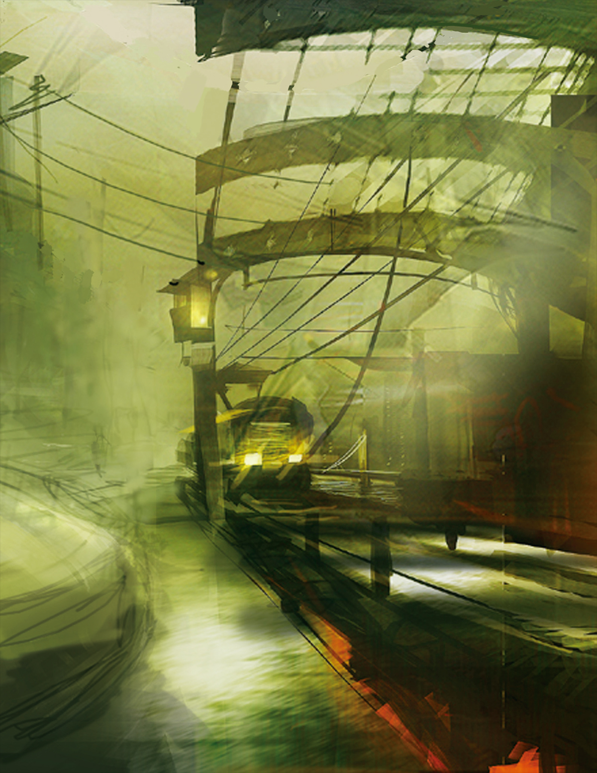 この作品は、定刻、駅に到着した列車がテロリストのミサイルの攻撃を受けた一瞬をテーマに描きました。私は「007」シリーズのようなアクション映画が大好きなので、そこからヒントを得ました。したがって、このシーンは様式化(スタイライズ)されたフィクションであり、リファレンスはほとんど使っていません。広範囲に渡る調査をせずに、純粋な想像力と視覚的な演出テクニックを駆使しています。