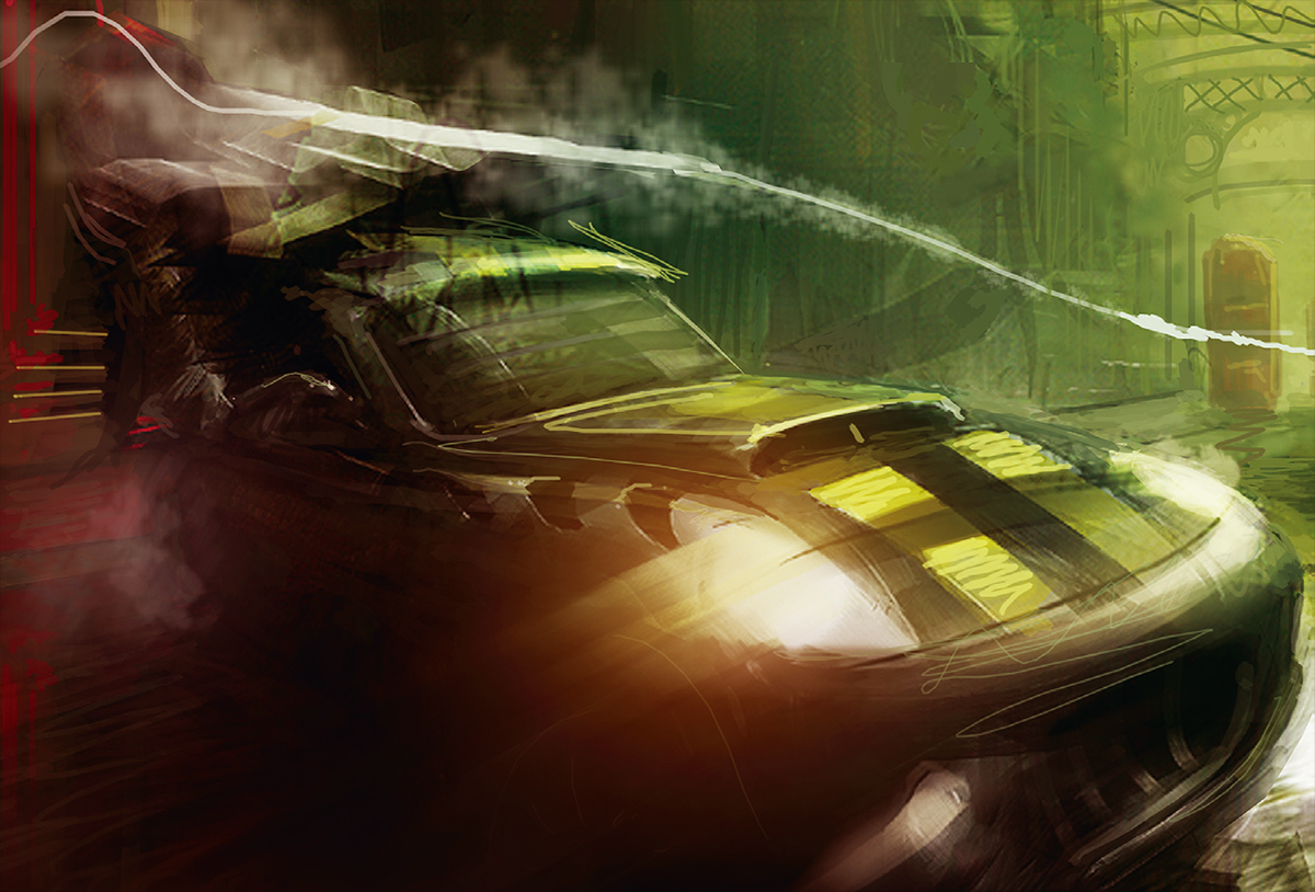 次に、環境光が最も強い光の領域や中間色の部分を塗りつぶします。つまり空、道路、自動車のボンネットといった箇所です。同時に、頭上の構造物からのソフトな影も描き込みます。