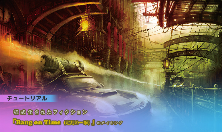 「Bang on Time (定刻の一撃)」は、粗削りで危険な雰囲気の環境(エンバイロメント)で、動きを強調した作品にしたいと思いました。大ざっぱで抽象的なスタイルを選び、全体のダイナミックな印象を出すため、必要な場所にディテールを加えています。