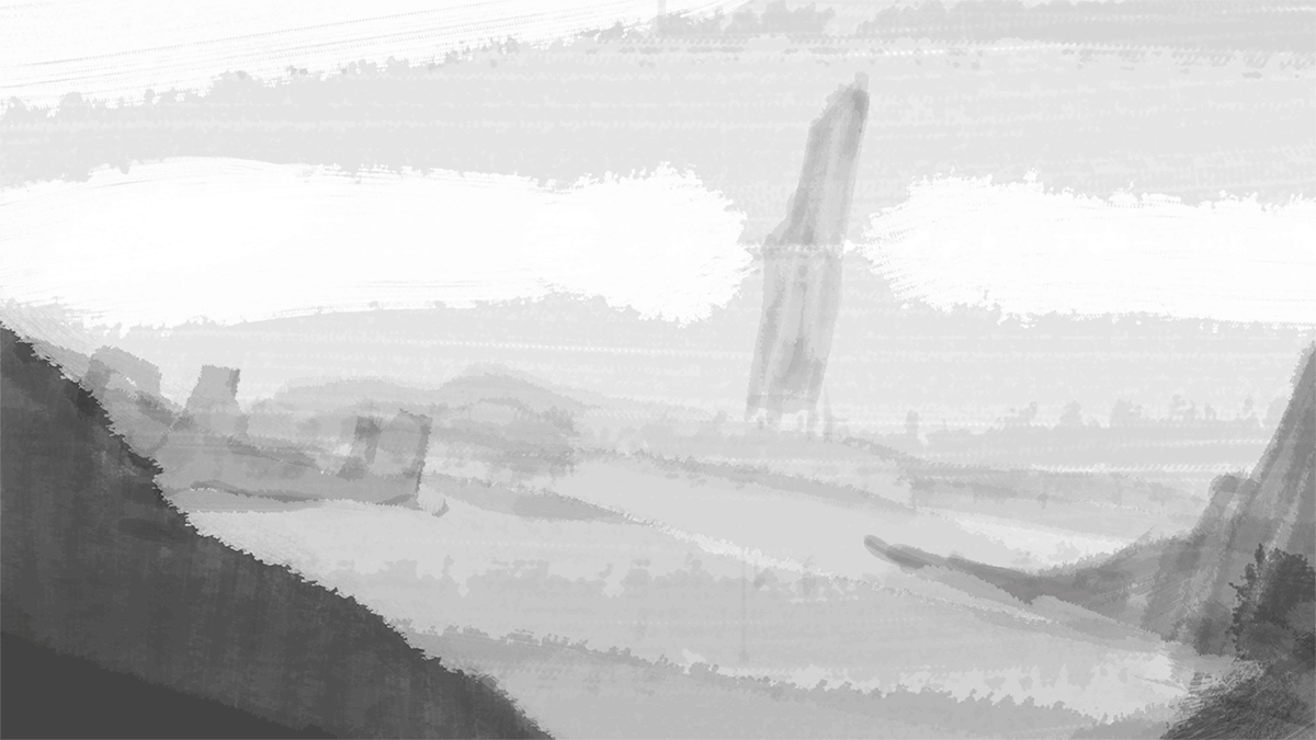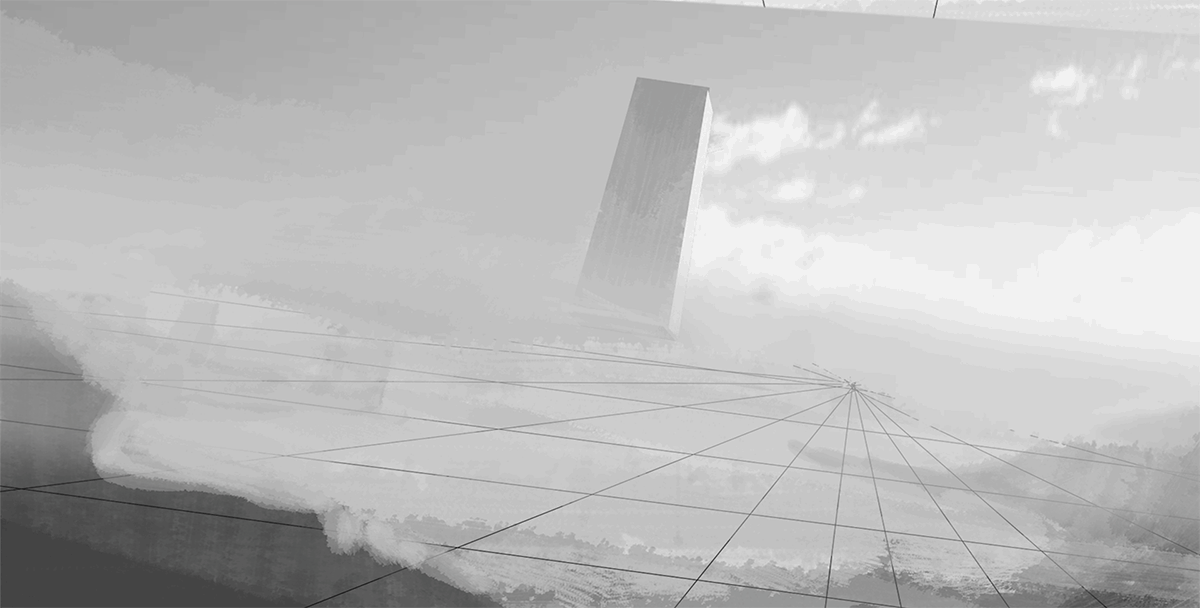 モノリスの位置はすでに決まっているので、それがメイン要素の1つになります。最初のスケッチは大雑把なラフで、シーンの雰囲気や構図をざっと確認するための、いわば「走り描き」です。その後、グリッドを使って少しずつ洗練させていきます。このグリッドがあれば、異なる構図でさまざまな解決策を試すことができます。