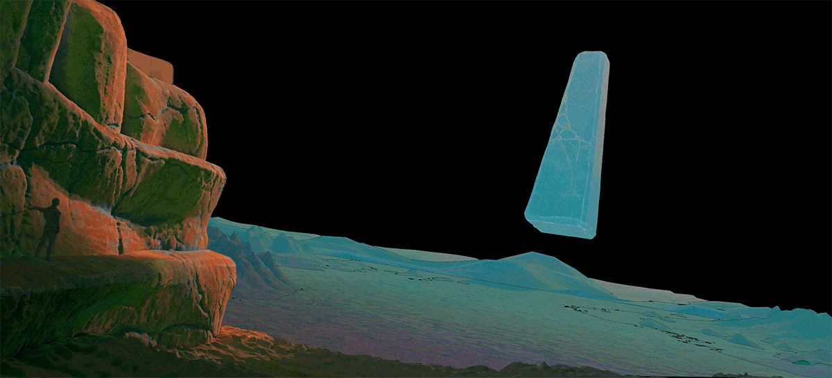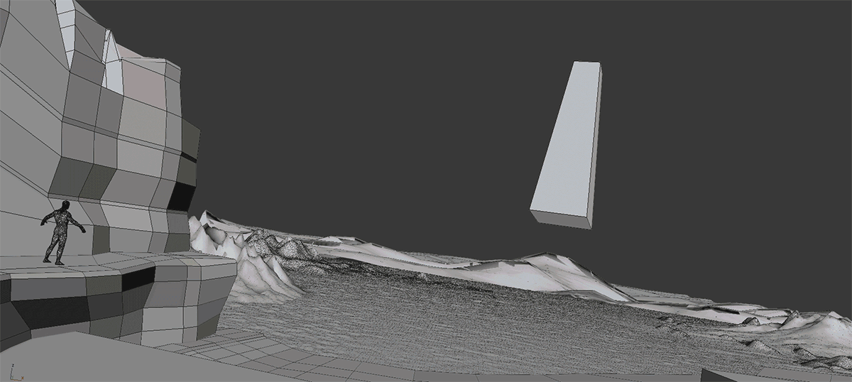 アイデアとスケッチの用意以外で重要なことは、「人間モデル」(今回はモノリスを見つめている男)の配置と、スケールの設定です。どの3Dソフトでも再現できるシンプルなモデリング手法を用いています。崖のベースモデルは、平面を押し出し、形を整えて作成しました。シーン内のものはほぼすべて平面です。崖はその後、ZBrush でスカルプトし、デシメート(ポリゴン削減)しました。
