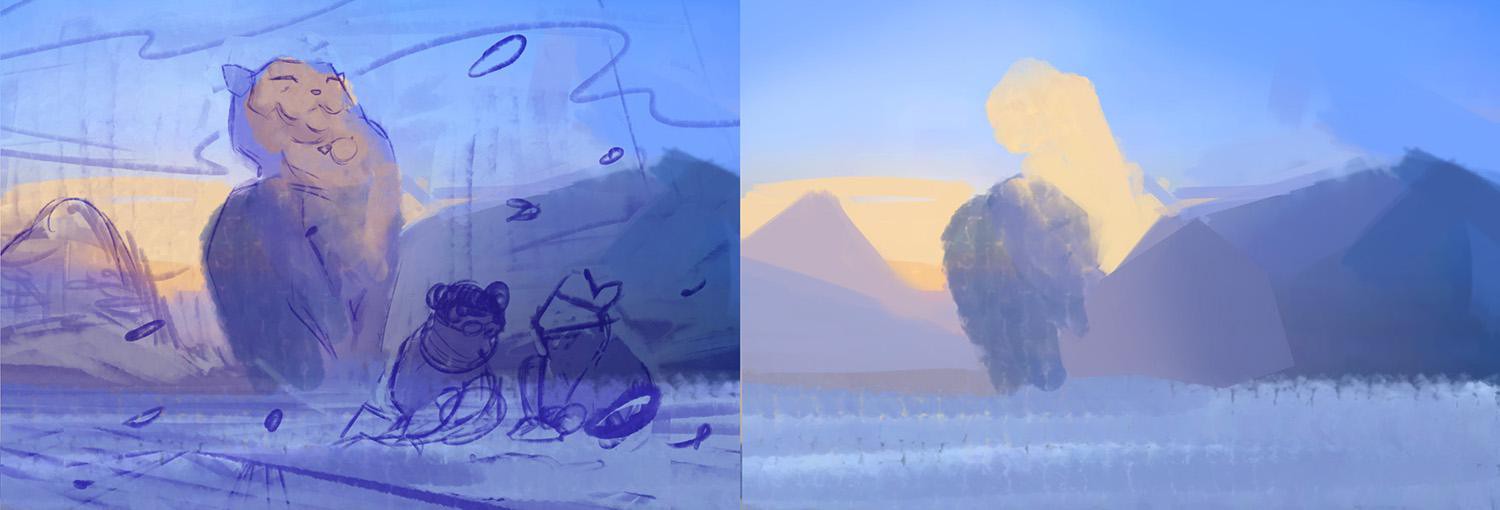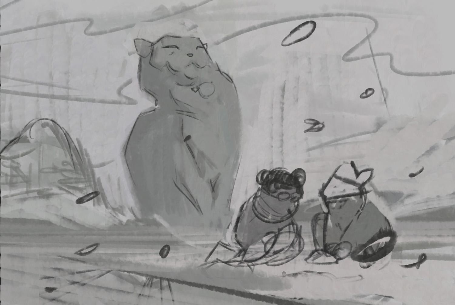 私は 犬派なので、猫を削除することにしました。この時点では、彫像なのか生き物なのか まだ決めかねていたので、作品のストーリーを練り始めます。マスクをかぶった2人の子供と、その周りの背景要素をスケッチしました。
