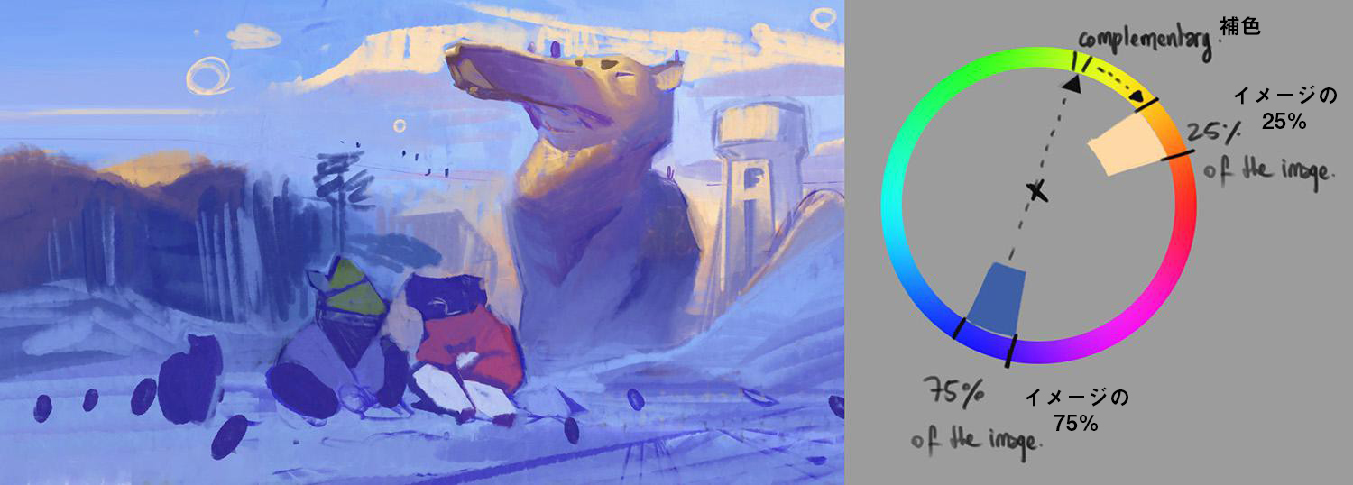 この作品を制作している間は、色相環の配色を意識していませんでしたが、ここでシンプルな配色の公式を紹介します: