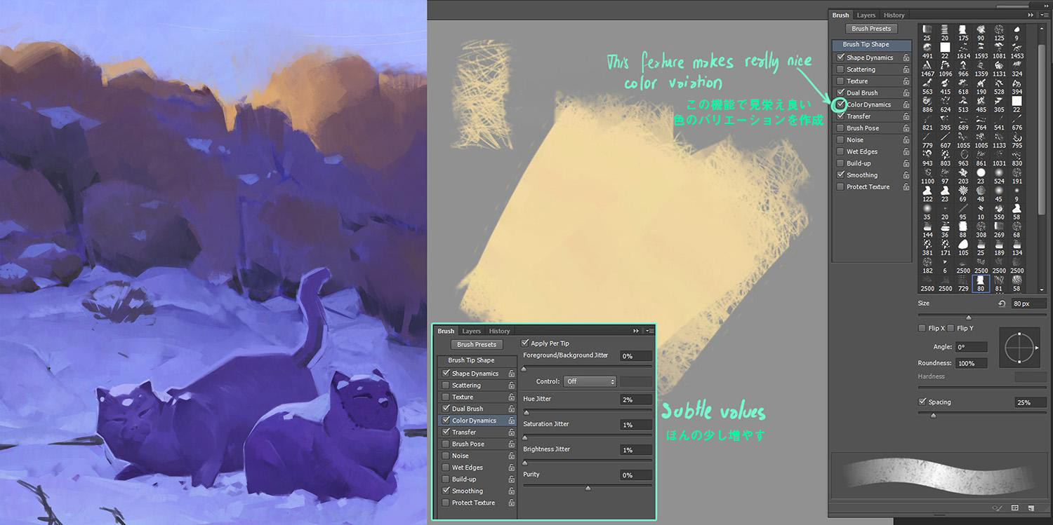 使用したブラシは、Shaddy Safadi のブラシパックから選んだ1種類のみです。ただし、[ブラシ設定]>[カラー]で[色相のジッター][彩度のジッター][明るさのジッター]を僅かに調整しています。微細な色のバリエーションを使って描くのが 私の好みです。これらのオプションを使えば、1回のブラシストロークでさまざまな色とトーンを表現できます。