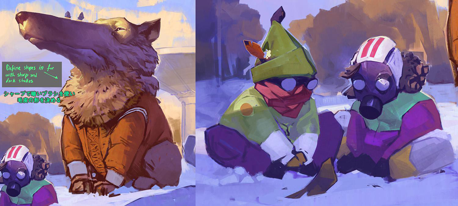 光の表現が定まり、シーンに奥行きと面白い雰囲気が加わったら、キャラクターのディテールを描き込んでいきます。シャープで暗いブラシを選び、明確な輪郭を作りましょう。犬には宇宙服のようなものを着せ、毛並みの方向を定めます。ここでは、ハスキー犬のリファレンスを探し、適度なブラシストロークで毛の質感を表現する方法を考えました。