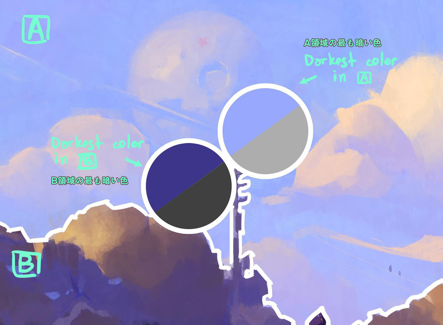 ディテールを加える際は、各領域で使用する色に制限を設けることをお勧めします。例えば、空に新しいオブジェクトを描く場合、その最も暗いトーンは、すでに設定した色よりも暗くしません。