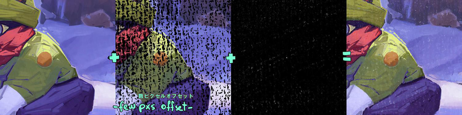 結果に満足したら、仕上げのテクスチャ(質感)を加えます。まず、イメージのコピーレイヤーを作成し、キャンバステクスチャでマスクをかけます。これにより、絵全体に布地のような質感が加わります。次に、このレイヤーの位置を数ピクセルずらします。テクスチャパターンが元の絵から少しずれることで、より自然でアナログな雰囲気が生まれます。