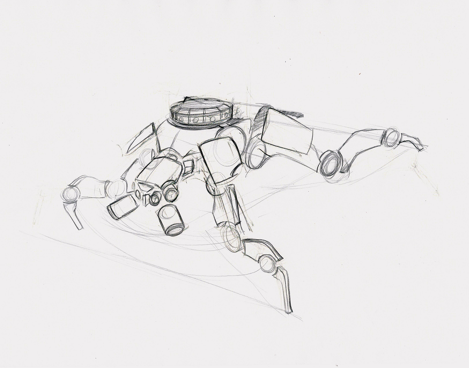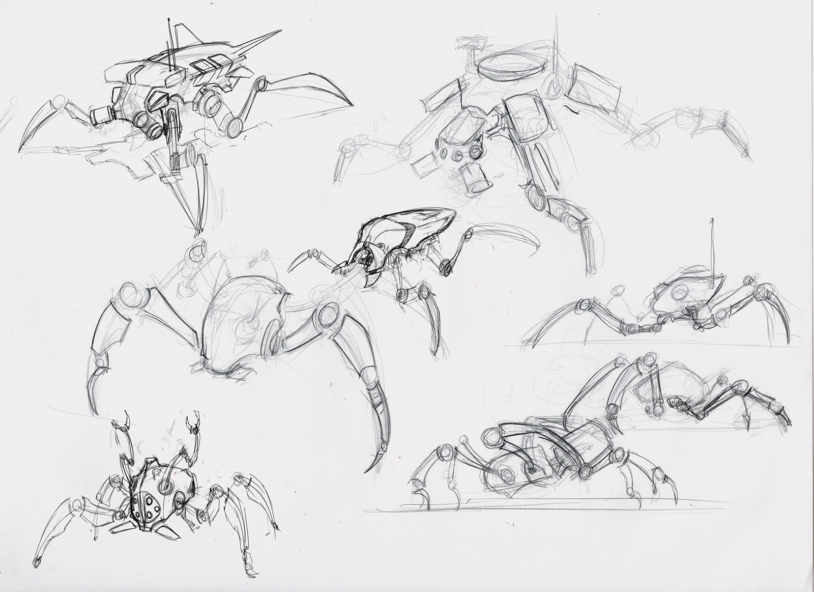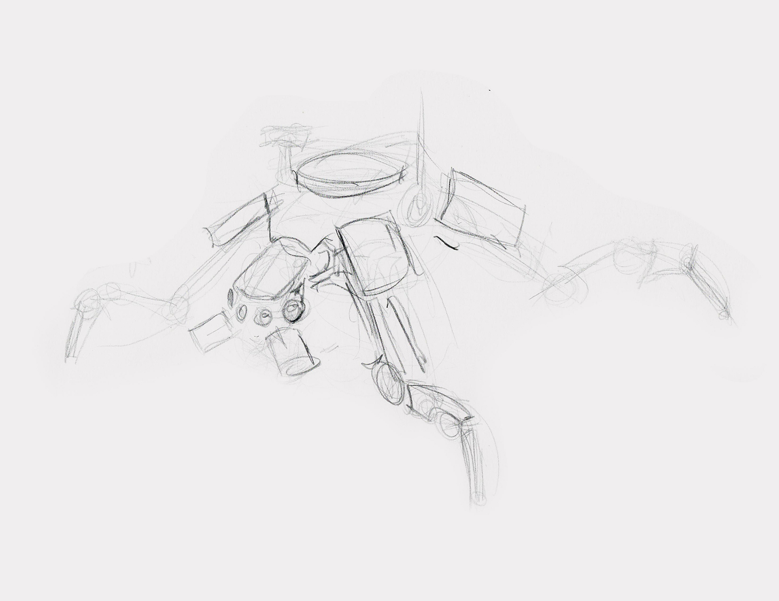 ラフな形状から始め、クモ や カブトムシ から インスピレーションを得ながら、特に 脚のつくりに注目します。大事なのは「ロボットが地形を這う様子を想像し、脚がどう動くかを考えること」です。自由な線で複数のアイデアを素早くスケッチしていきましょう。この段階では完璧さは求めず、アイデアの幅を広げることに集中してください。
