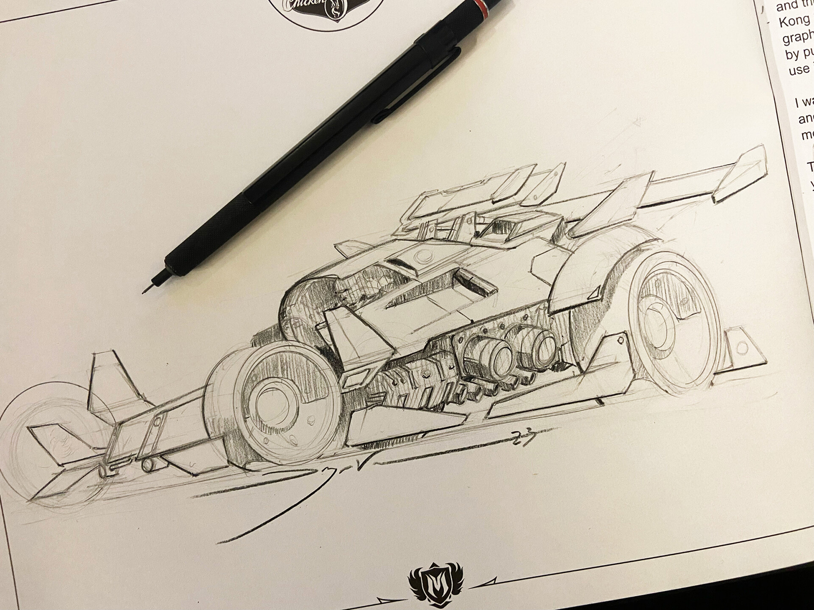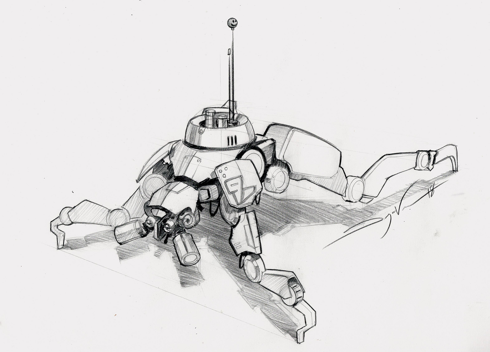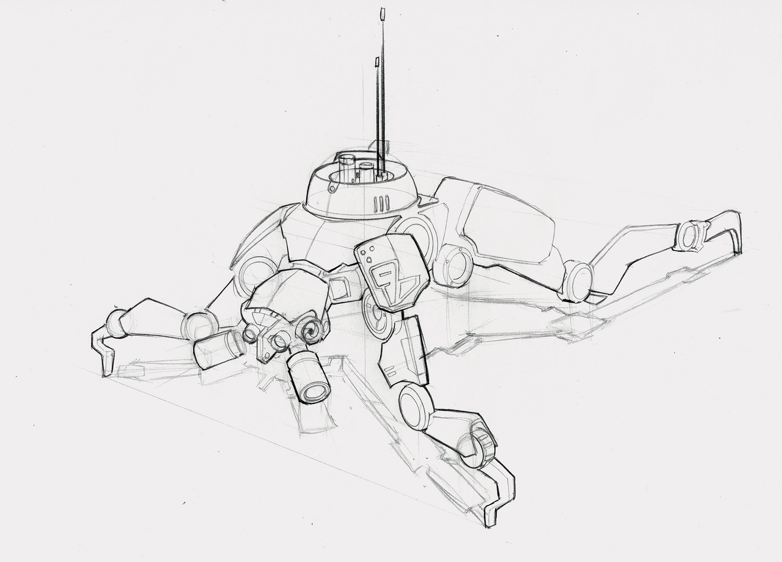 ラフな形状から始め、クモ や カブトムシ から インスピレーションを得ながら、特に 脚のつくりに注目します。大事なのは「ロボットが地形を這う様子を想像し、脚がどう動くかを考えること」です。自由な線で複数のアイデアを素早くスケッチしていきましょう。この段階では完璧さは求めず、アイデアの幅を広げることに集中してください。